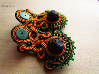 Cóż... praca wre. Haftowanie kolii dobiega końca. Już niedługo pokażę rezultaty, na pewno jeszcze w tym tygodniu :) Jeszcze w czerwcu zapisałam się na wymiankę u Diany i udało mi się już prawie przygotować niespodziewajkę dla Oli. Prawie bo w głowie mam projekt jeszcze jednego elementu tylko jakoś czasu brakuje na wszystko. 22 sierpnia prezentacja wymiankowa i będę mogła pokazać rezultaty. A tym czasem, borem, lasem sztyfty w kolorach tytułowych. Rzadko zdarza mi się robić sztyfty, bo jakoś tak łatwiej jednak podpiąć kolczyki do zwykłych bigli. Tym razem użyłam lawy wulkanicznej, zielonego howlitu i maleńkich koralików nocy Kairu. Jak wyszło ? proszę bardzo....