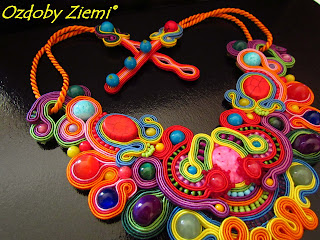Projekt jest dość duży i miałam obawy, że nie zdążę. Pomimo tego udało się... i jest - wielokolorowy naszyjnik stworzony w technice sutasz ( a jakiej by innej). Rodzaje kamieni trudno wymienić bo jest ich sporo. Sam naszyjnik jest raczej duży (największy jaki do tej pory zrobiłam i najbardziej "na bogato". Właśnie policzyłam - jest w nim 45 kamieni :-) i masa koralików toho. Trochę szalone połączenie kolorów ale właśnie chyba o to chodziło - żeby było słodko i zabawnie :-)