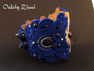 Komplecik szafirowo beżowy z nutką złota. Główną rolę gra lapis lazuli z niewielkim dodatkiem pereł słodkowodnych i trochę większym koralików toho permanent finish galvanized aluminium. Poszalałam troszeczkę z haftem koralikowym :) Bransoletka to największy okaz jaki kiedykolwiek poczyniłam - na całym obwodzie ma szerokość ok 9 cm.